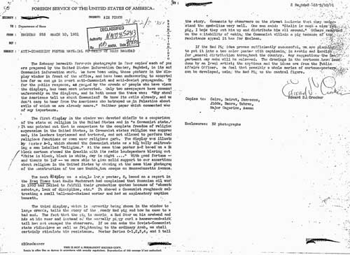 سند مربوط به نامه ی کراکر است از بغداد به وزارت خارجه آمریکا و شرح اثر کاریکاتورها بر مردم و مفید دیدن ادامه ی آن در تبلیغات ضد شوروی. |